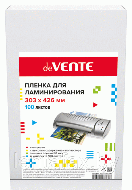 Пленка для ламинирования "deVENTE" A3, толщина 80 мкм, 100 л. Цена указана без учета НДС 20%